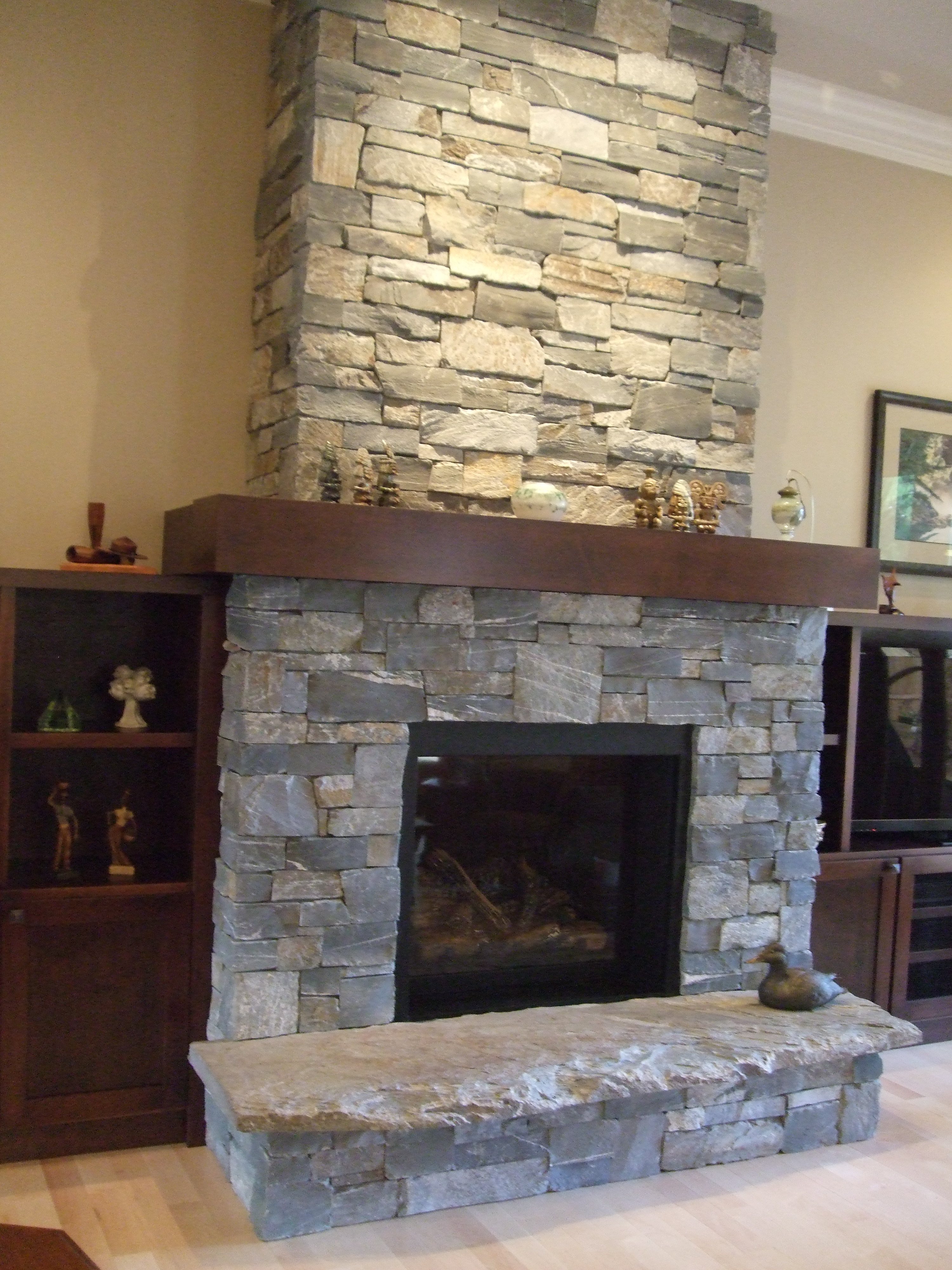 An Okanagan home located in Kelowna BC features a traditional fireplace design with a wood mantel, Ocean Mist Ledge Stone Veneer and an Ocean Pearl Natural Top Hearth.