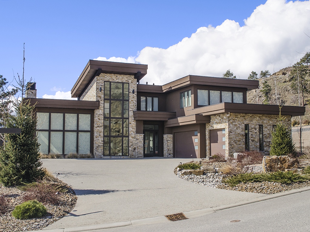 The exterior of this modern architectural design is faced with Kettle Valley Country Cottage Ledge Stone Veneer.
