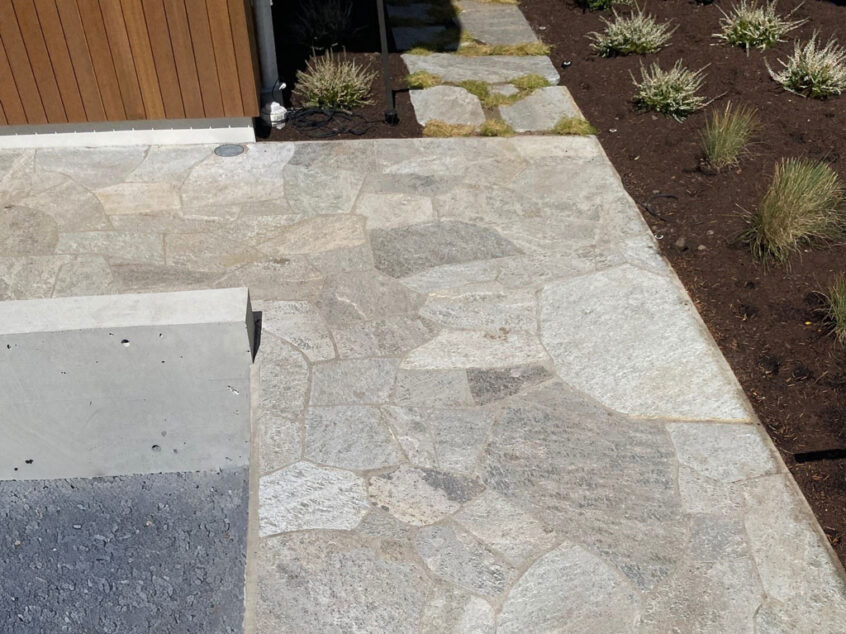 White Mist Quartzite Flagstone provides a distinguished luster of white and light grey, which blends well with most color palettes. Quartzite flagstone is available in two different thicknesses, standup for mortar set applications and laydown for sand set applications.